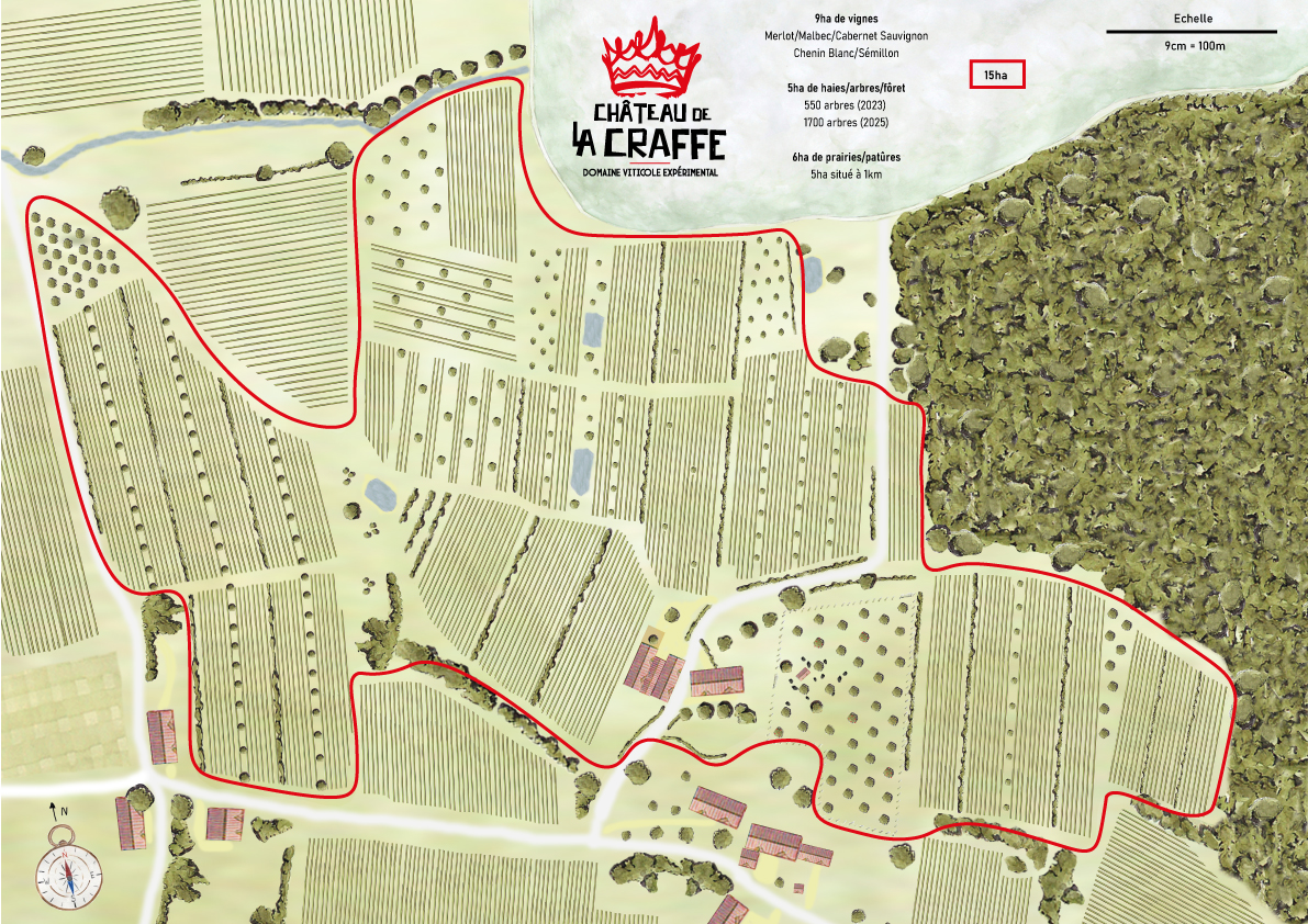 Certifié biologique depuis sa reprise en 2021, le Château de la Craffe est un domaine viticole et arboricole de 20 hectares, exploité sans pesticides, engrais synthétiques, ni insecticides, où l'eau, le sol, les vignes, les animaux, les arbres et la biodiversité s'épanouissent ensemble.